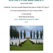 The tablet was the work of David Brearley, a local builder and mason, who also made the war memorial cross which stands in the churchyard at Bolsterstone. Two of David’s sons Archie and David Ivor fought in France, but sadly Ivor did not return. The tablet was unveiled and dedicated before a large congregation on Sunday 3rd June 1917, a month after David Ivor had been killed. Special hymns were sung, and and after the lesson Alfred, Lord Tennyson’s “Crossing the Bar” was rendered by the choir and congregation, Master H. Vardy taking the solo part. At the close and while the congregation were standing the choir sang the anthem, “The long day closes” by Arthur Sullivan.
